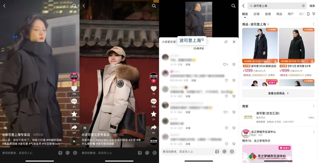 波司登的地区门店号则通过城市地标模特上身穿搭、降温特点、门店场景等视频内容,激发出“波司登上海”小蓝词,用户点击后不仅可以搜索出相关产品,还能出现相关门店信息。