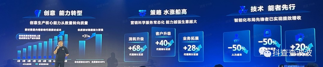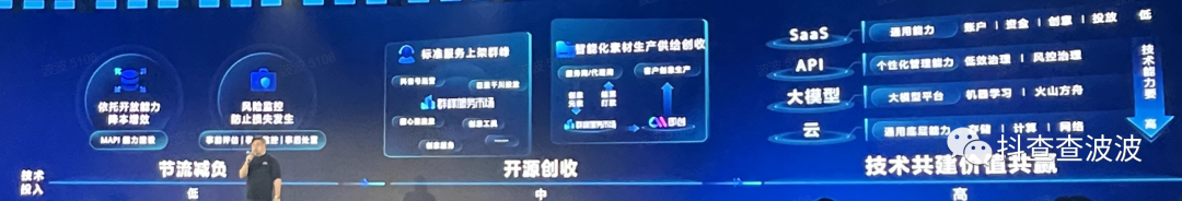 3)技术层面:没有技术能力的团队,要积极拥抱各种技术工具和系统的学习和运用,用工具去提升自身生产力,有技术能力的团队要深入到业务一线,利用技术能力提高流量获取能力(创意和投放工具化、自动化),与官方的SAAS、API、大模型、云等平台共建技术,快速拿到结果,快速推广和应用。
