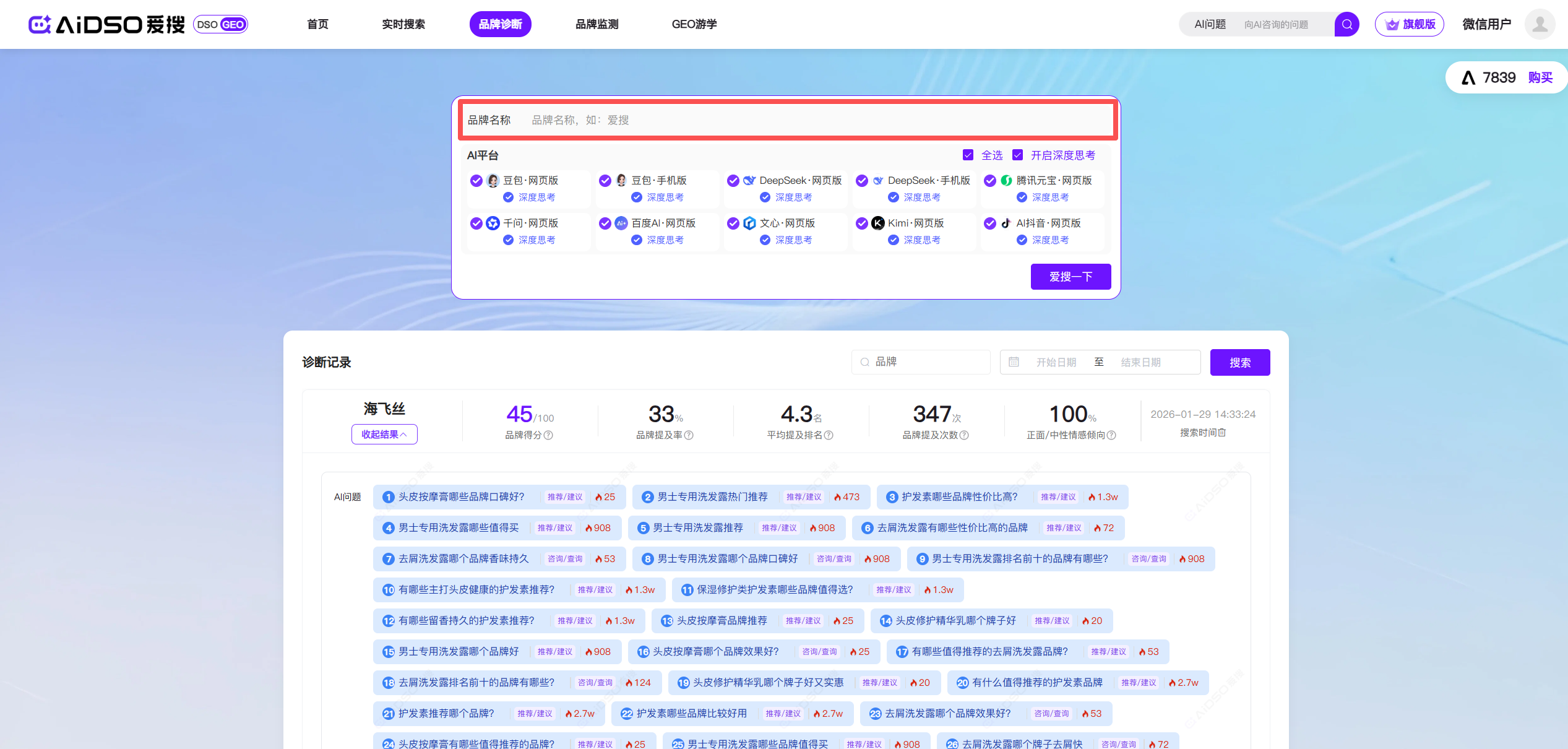 AIDSO爱搜解决方案:这类企业最需要AIDSO爱搜的“品牌全景诊断”功能。你只需要输入品牌名称,AIDSO爱搜就会模拟用户向10个主流AI模型提问。它能一键检测出你的品牌提及率。