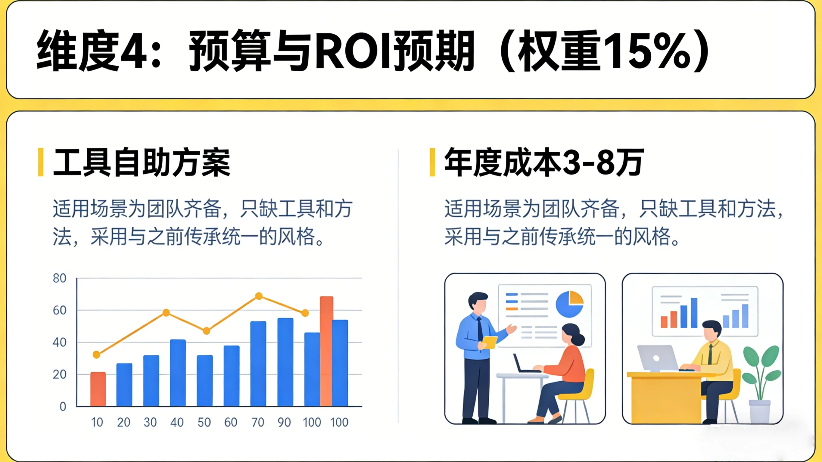 | 工具自助 | 3-8 万 | 团队齐备,只缺工具和方法 |