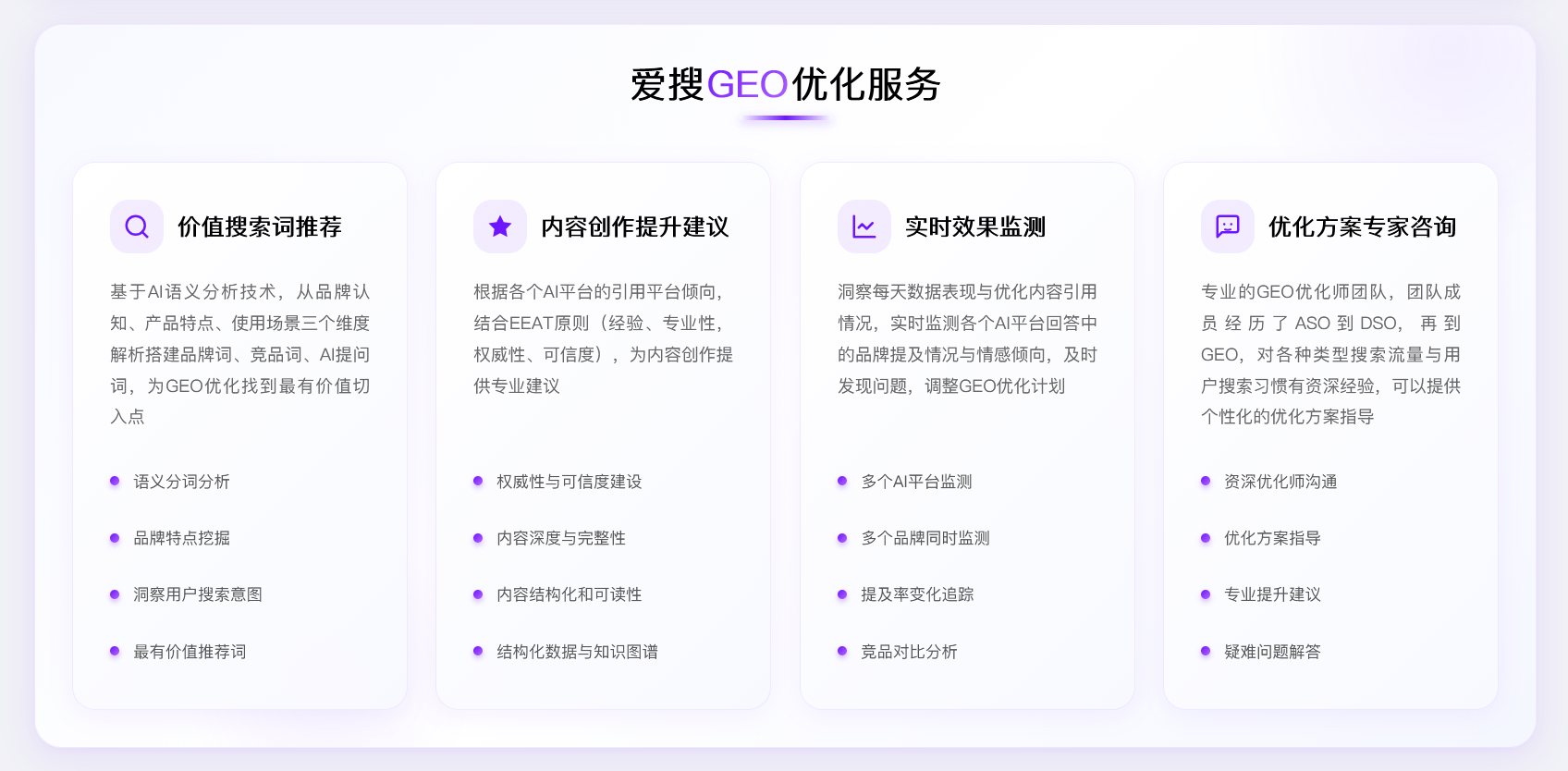 爱搜是国内的 AI 搜索优化(GEO)解决方案提供商,服务覆盖豆包、Kimi等主流 AI 搜索平台。我们帮助企业在 AI 搜索时代建立持续的流量优势