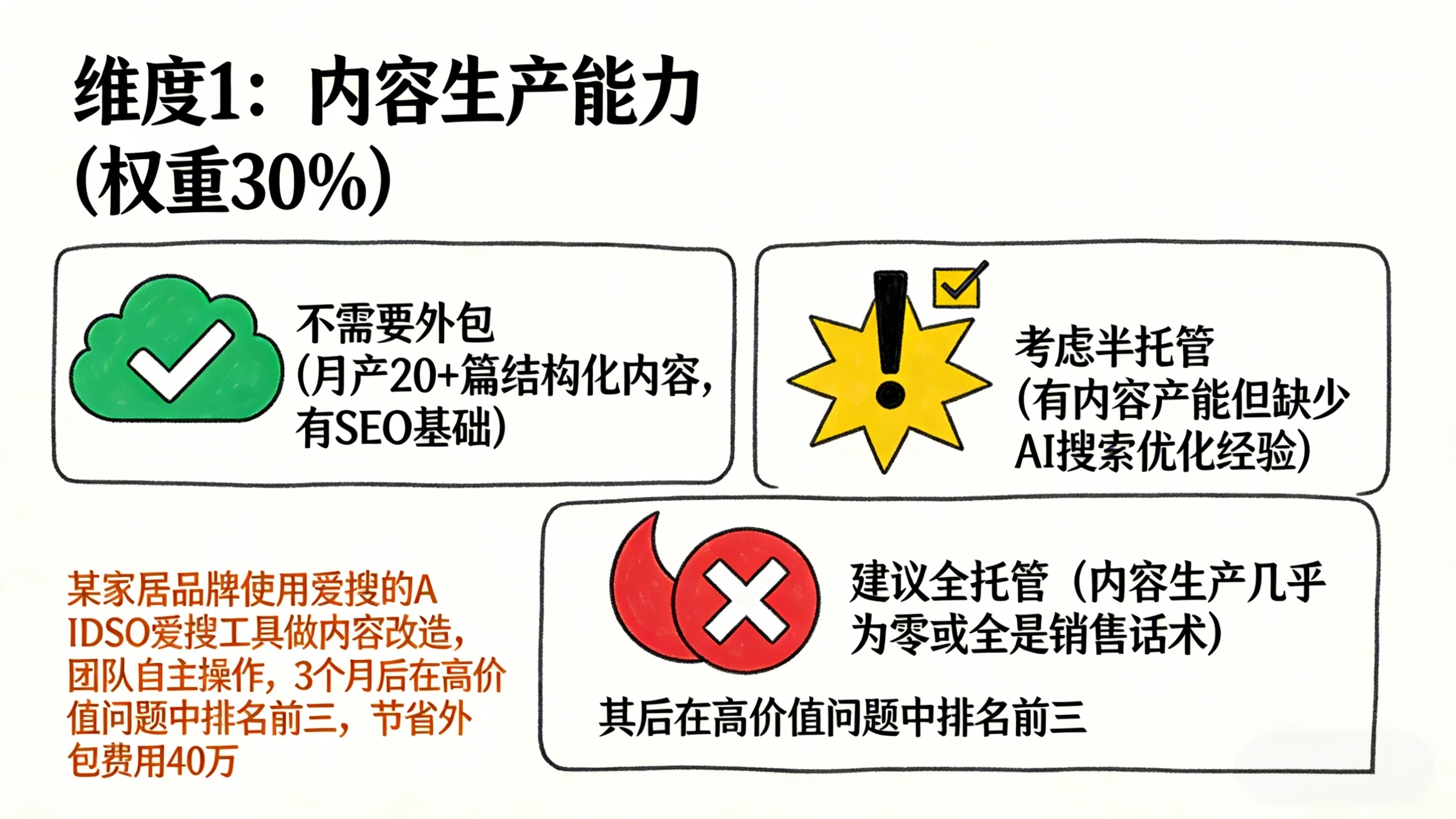 比如:某家居品牌使用爱搜的 AIDSO爱搜工具做内容改造,团队自主操作,3 个月后在高价值问题中排名前三,节省外包费用 40 万。