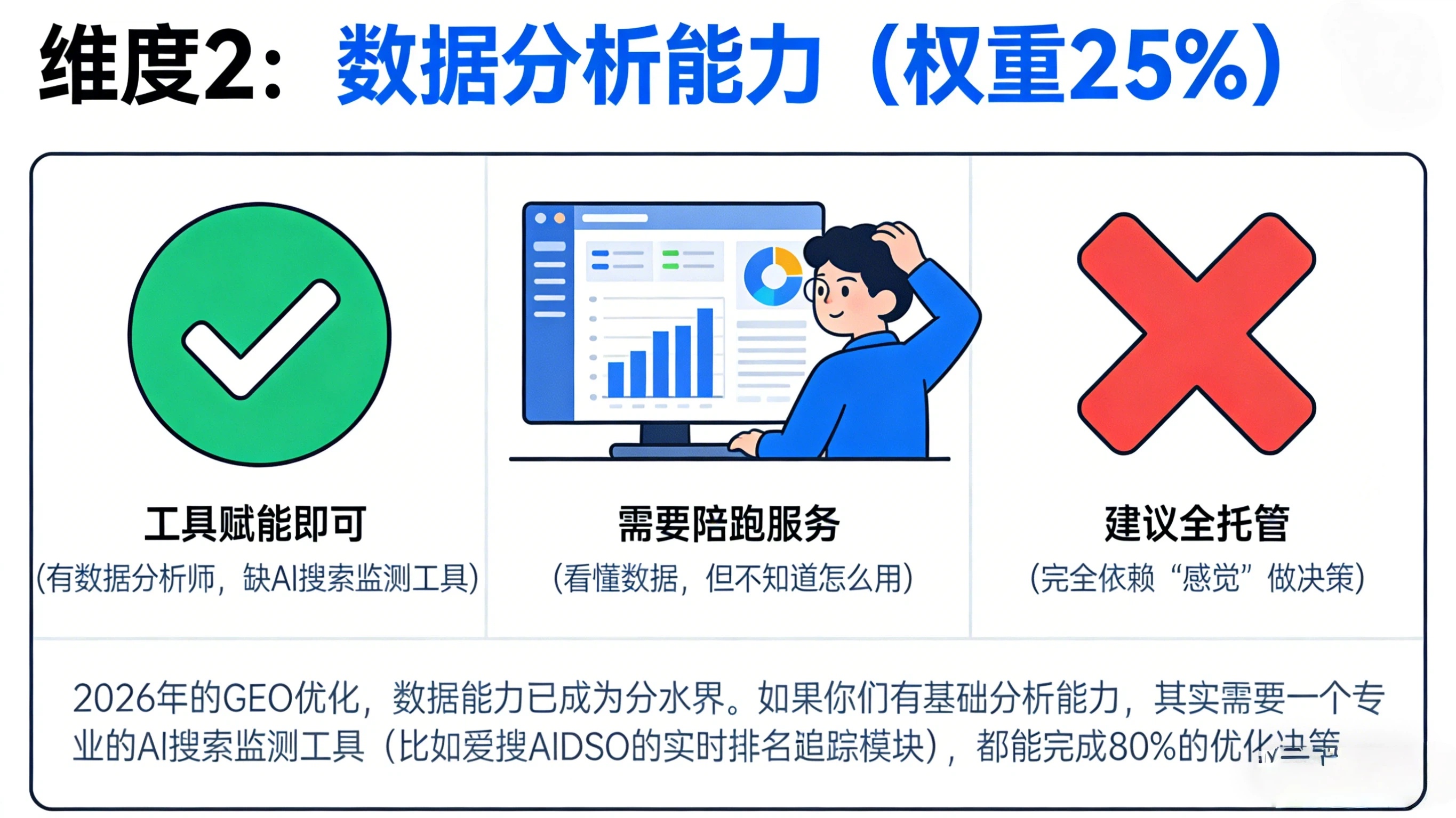根据AIDSO爱搜的调查数据,我们发现:约 80% 咨询 GEO 外包的企业,其实具备自主优化的基础条件,只是缺少一套判断框架