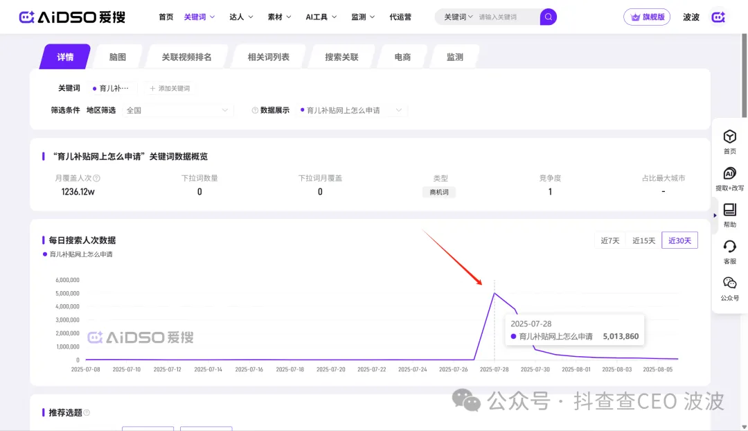 我们先来看一个案例,通过数据平台的关键词流量看到,育儿补贴的搜索流量暴增,说明这个需求是一夜之间出现的,而且是全平台的。