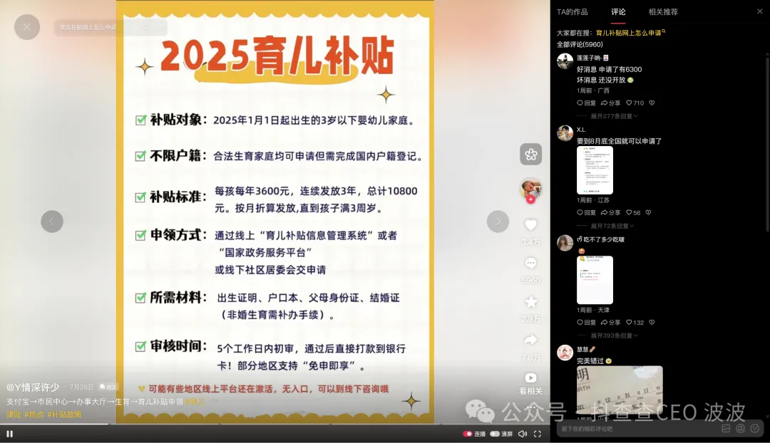 我们发现,一个抖音小号吃到了这波流量,这条28号发布的图文内容,获得了3.4万点赞,5960条评论,2万的收藏,7.8万的转发。要知道,这些流量是高价值的爸妈人群为主。^_^而这个账号只有2000多的粉丝,其他的内容都是20个赞左右,妥妥的小破号。