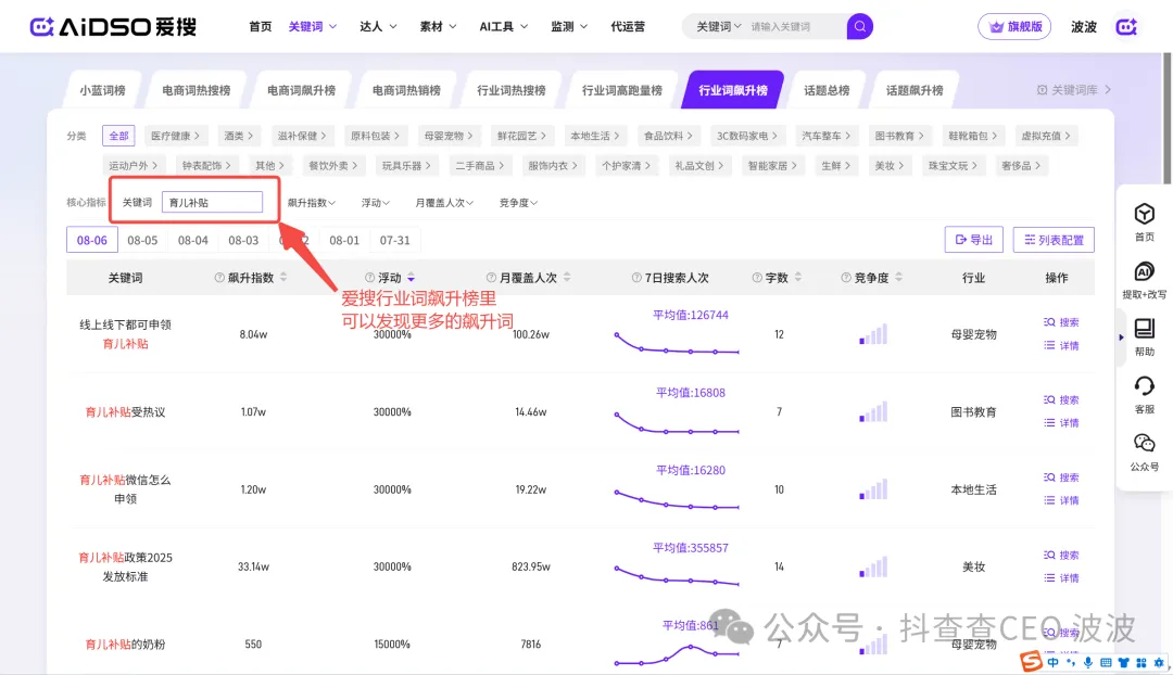 爱搜的行业词飙升榜里面也可以捕捉更多相关的飙升词。