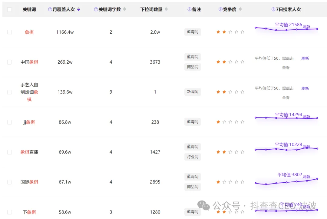 2)选择月覆盖人次高,竞争度<3,近7日搜索均值>50 的关键词;(找到的基本为主词)