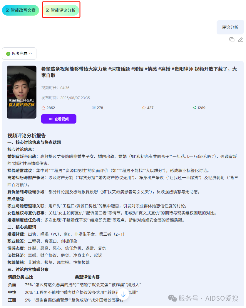 好消息,AIDSO爱搜进行了重磅的功能更新:多平台的视频和图文直接提取,同时进行智能改写,还能分析作品的评论内容。^_^