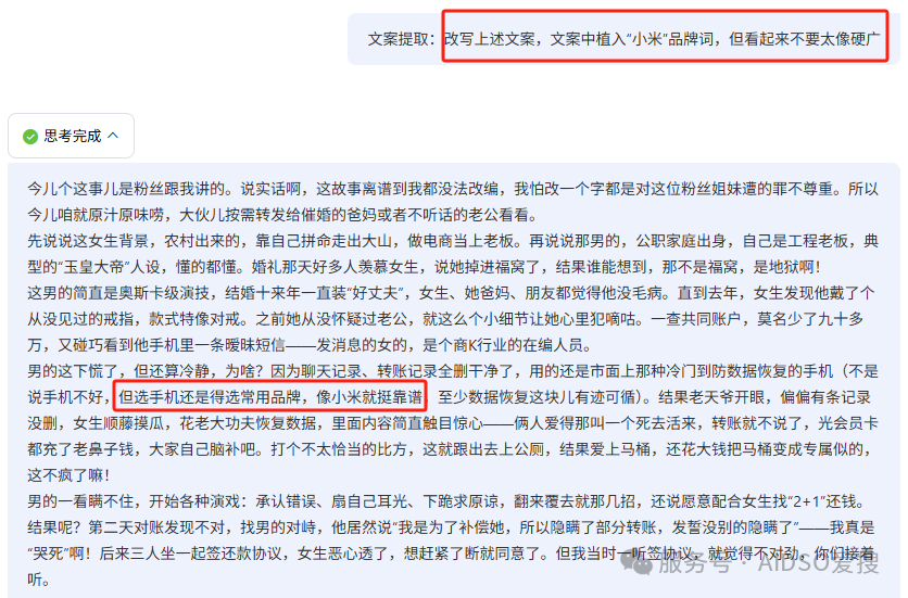 比如:改写上述文案,文案中植入“小米”品牌词,但看起来不要太像硬广