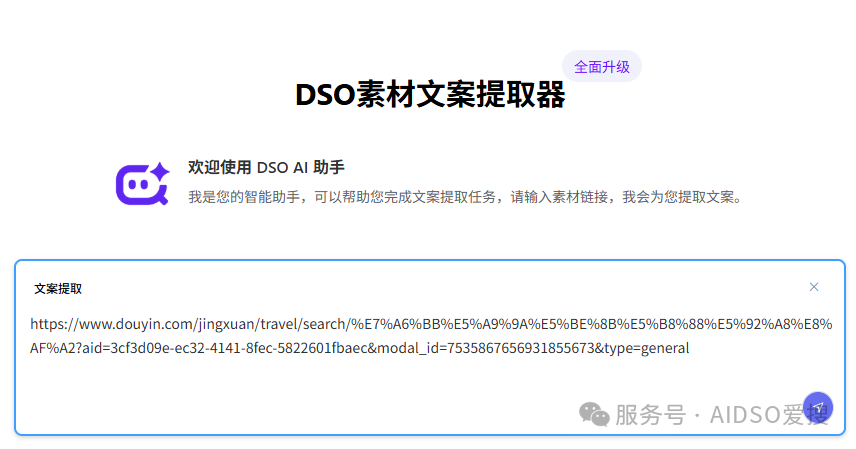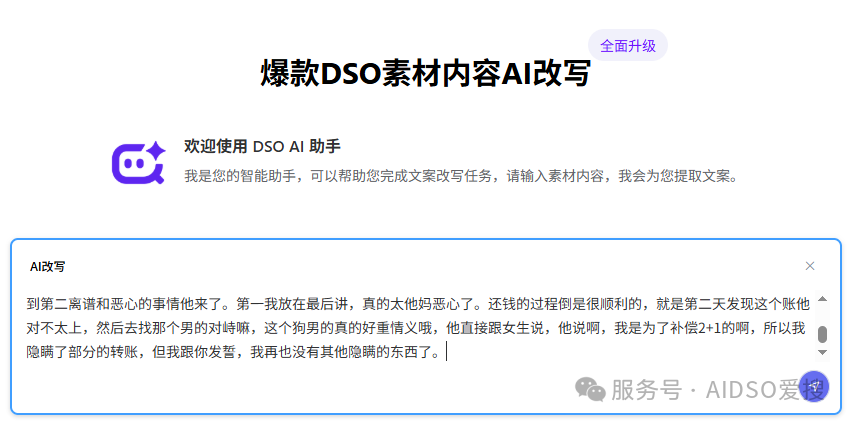 为了让创作更高效,AIDSO爱搜AI文案提取与改写工具(AI版)正式上线,集 作品文案提取、文案改写、评论分析 三大功能于一体,一站解决创作前期的全部准备工作。