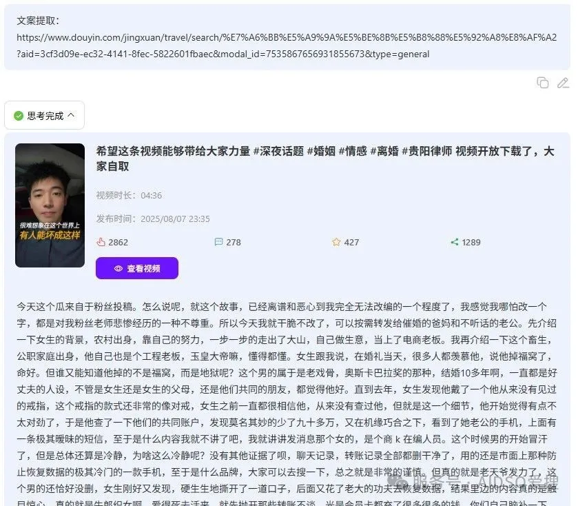 结果中包含了视频基础信息和视频文案文本。点击“查看视频”按钮可以直接跳转到相应官方平台去查看。