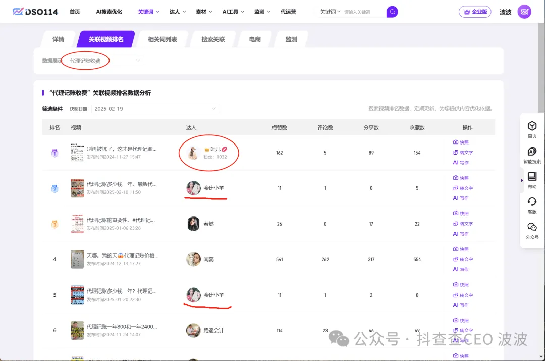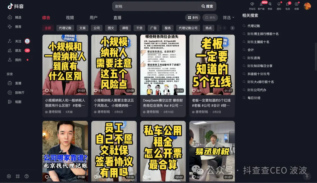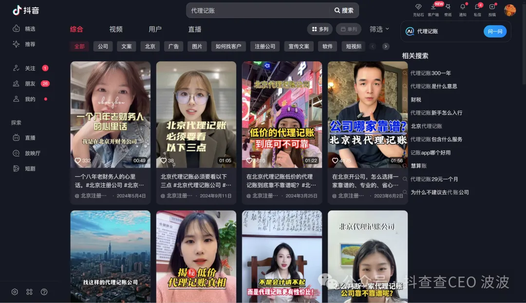 搜索结果情况,当前是单人口播在前面,说明大词下还没有专业的DSO人员进行线索获取的操作 = 利好好消息:不太卷!