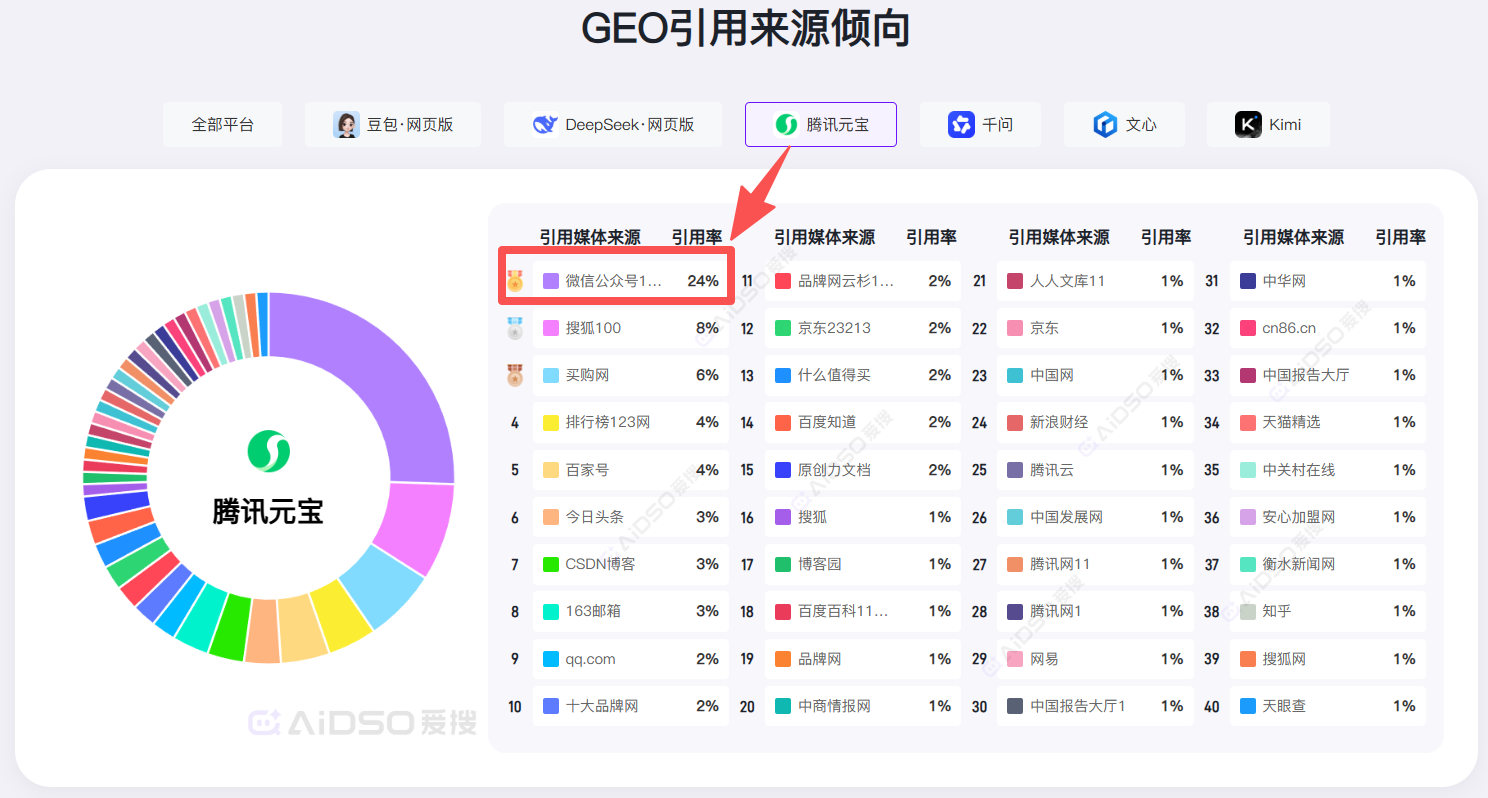 国内大模型(如腾讯元宝)在生成答案时,会深度抓取微信公众号(占比高达24%)、今日头条、小红书、知乎等平台的内容。