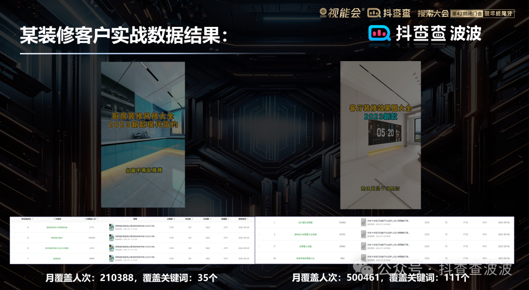 下图是我们帮某装修客户做的一系列视频中比较出色的两条视频的关键词抢占成果数据。两条视频分别拿到了几十个甚至上百个关键词的搜索高位,覆盖每个月几十万的搜索人次。