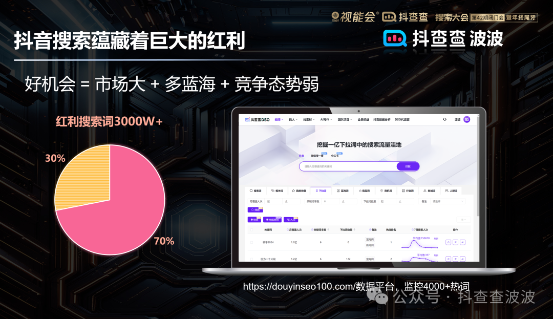 在我们的关键词监控工具中,针对有流量的4000万个词进行分析,其中70%的长尾词,争抢非常不激烈,排在第一名的视频就几个点赞,也就是说你发布一条DSO内容,就有极大的机会去覆盖上这个词,甚至是直接抢占的高位。^_^