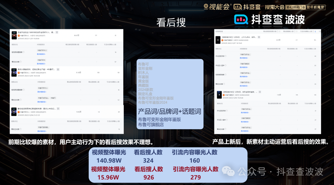 针对布鲁可积木的官方自播直播间,我们尝试在短视频上,增加“手办”、“积木”、“变形金刚”等,行业词、品类词、IP词,将不同兴趣的人群,引入直播间,打上账号标签后,利用投流放大,从而扩大了自身的流量池。同时增加看后搜引导,会进一步增加人群精准度,从而提升视频带货转化率