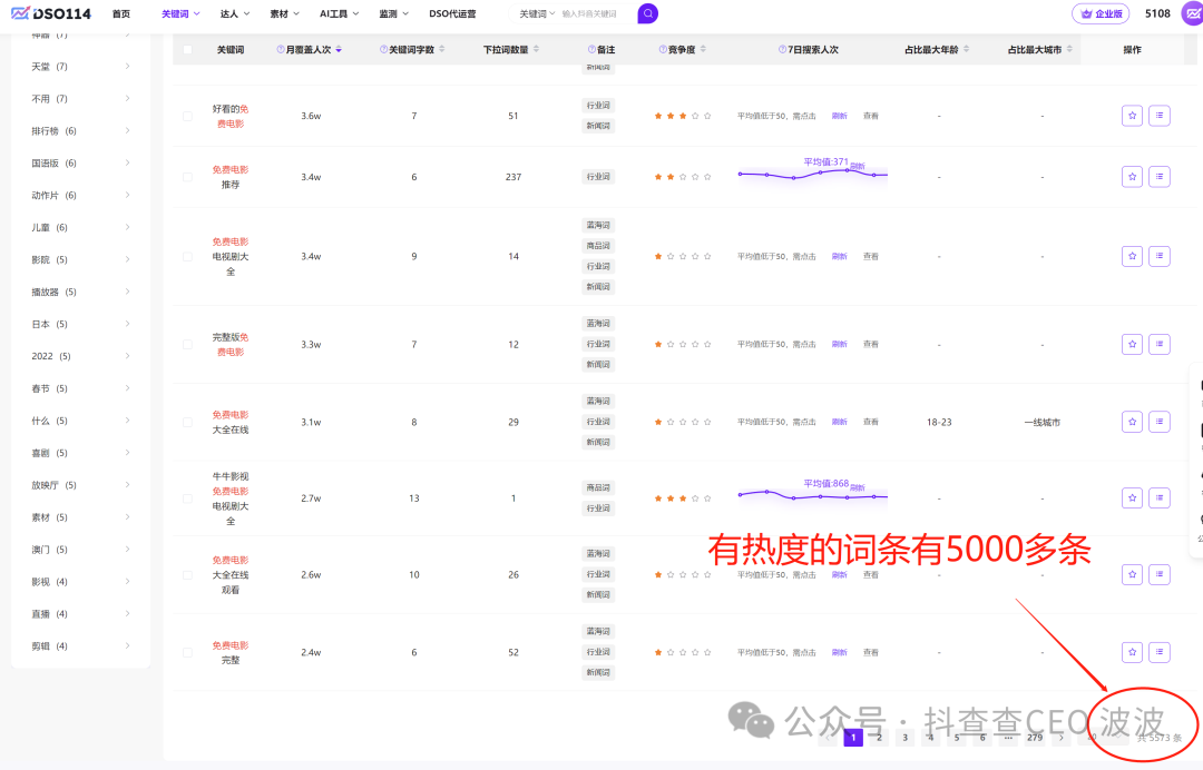 首先在DSO114平台搜“免费电影”,可以看到有大量的关键词有比较高的热度。有热度的词条超过5000条,还有“电影资源”、“电影天堂”... 这样的词每条都有过千条的相关长尾词。